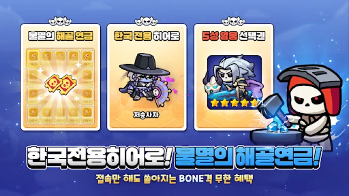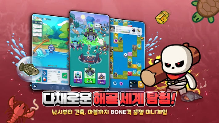 끝없는 전투에만 집중하는 RPG는 이제 그만! 자신만의 독특한 지하 세계를 경영하고 꾸미는 재미를 만끽하세요. 묘지를 확장하고 해골 병사들을 파견하며 영향력을 넓혀갈 수 있습니다. 각 건물에 숨겨진 특별한 버프를 활용하여 해골왕의 권능을 드높이고, 낚시의 한가로움부터 보드 게임의 전략, 미니 대전의 짜릿함까지, 다채로운 콘텐츠 속에서 해골들의 특별한 일상을 여유롭게 즐겨보세요.