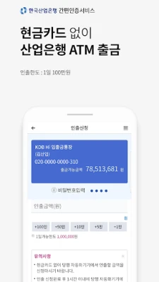 정확하고 빠른 알림 서비스는 입출금 거래 내역부터 펀드 수익률, 환율 정보, 예금 만기일 등 중요한 금융 소식을 놓치지 않도록 푸시 알림으로 전달합니다. 또한, 스마트KDB는 퇴직연금을 포함한 인터넷 뱅킹의 다양한 금융 상품을 모바일 환경에서도 손쉽게 관리할 수 있도록 지원합니다. 실물 카드가 없어도 스마트폰으로 모바일 현금카드를 발급받아 ATM 서비스를 이용할 수 있어, 고객님의 금융 활동에 제약을 없애줍니다. Korea Development Bank는 고객님의 안전하고 끊김 없는 금융 여정을 위해 필수적인 접근 권한만을 요청하며, 신뢰를 바탕으로 한 최상의 뱅킹 서비스를 제공하기 위해 노력하고 있습니다.